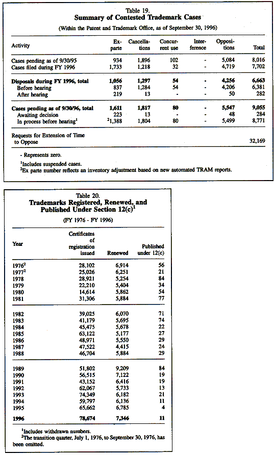 During FY 1996, the number of ex parte appeals taken from decisions of the Board of Patent Appeals and Interferences, the Trademark Trial and Appeal Board, and the number of civil actions filed against the Commissioner of Patents and Trademarks, totaled 71. There were 33 inter partes cases taken to the Federal Circuit in FY 1996. Although there were several significant court decisions, most of the opinions entered by the Court of Appeals for the Federal Circuit and the district courts were not precedential. This section highlights some of the significant rulings of FY 1996.