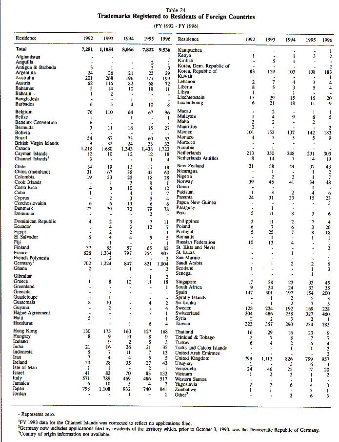 The Trademark business area continued to maintain 100 percent financial self-sufficiency in FY 1996; however, a steady increase in the receipt of trademark applications and insufficient staff to process incoming workload continued to impede the business areas ability to achieve targeted pendency goals. The Trademark business area predicted two factors would impede its ability to achieve targeted performance goals: 1) applications are subject to economic and political changes in the United States and abroad, and 2) application examination times are subject to technical complexity of applications, examiner experience, response time of applicants to office actions, and the number of trademark examiners available for examining. Since the implementation of the Trademark Law Revision Act (TLRA) in 1990, which established intent to use (ITU) as a basis for filing, annual increases in filings have averaged eight percent, and have averaged over 12 percent since FY 1992. Applications filed under TLRA have increased as a proportion of total filings to nearly 60 percent of all applications; unfortunately, human resource levels have been insufficient to keep pace with customer demand, causing pendency to rise continually above plan. While the Trademark business area is applying several corporate foundation strategies, Enhancing Human Resources, Leveraging Information Technologies, and Employing Better Processes, to enhance its process and to move the business toward improved performance, the greatest potential for performance improvement will come from reducing or eliminating the number of processing activities in the current production process.