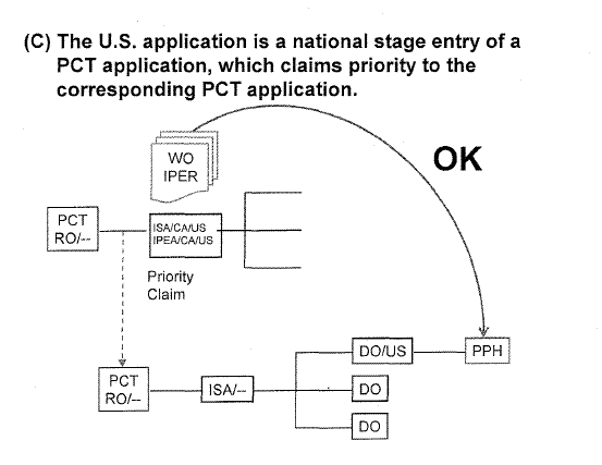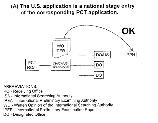 (1) The relationship between the corresponding U.S. application for which participation in the PCT-PPH pilot program is requested and the PCT application satisfies one of the following requirements (note that RO/-- as used in the diagrams below refers to an international application filed under the PCT in any competent receiving office):