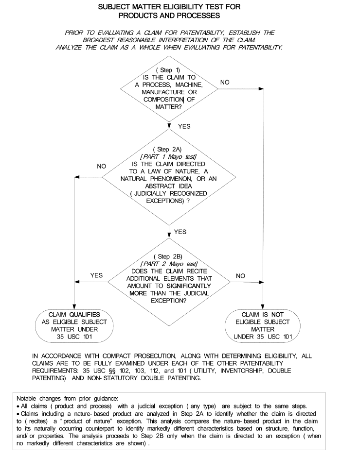 The following flowchart illustrates the subject matter eligibility analysis for products and processes to be used during examination for evaluating whether a claim is drawn to patent-eligible subject matter. It is recognized that under the controlling legal precedent there may be variations in the precise contours of the analysis for subject matter eligibility that will still achieve the same end result. The analysis set forth herein promotes examination efficiency and consistency across all technologies.